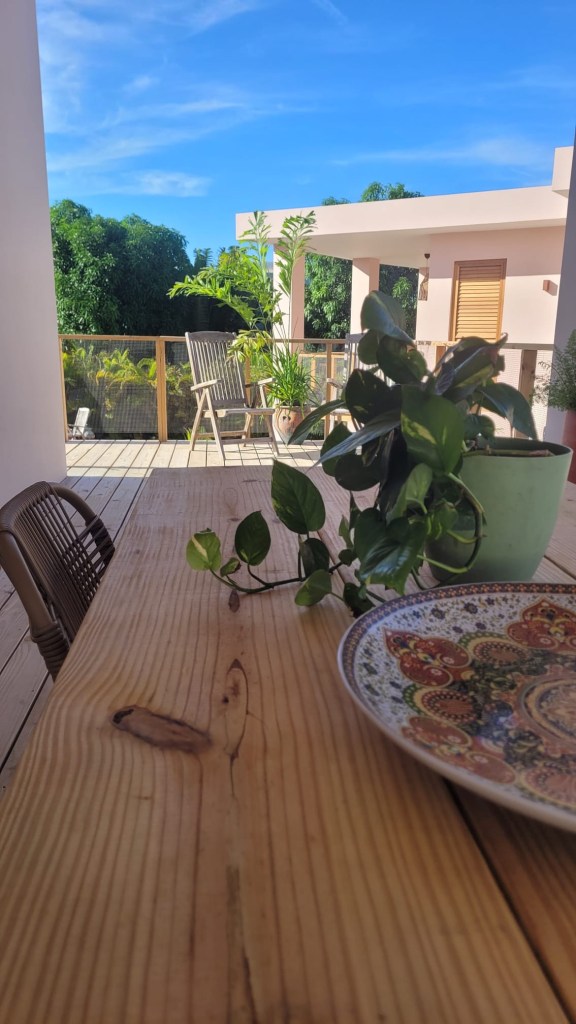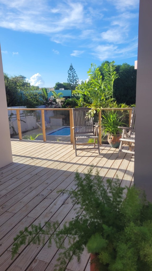 De woning is stijlvol ingericht met lichte kleuren en natuurlijke materialen. Rondom het huis loopt een ruime veranda, de perfecte plek om buiten te ontbijten, een boek te lezen of te genieten van de passaatwind, terwijl kleurrijke tropische vogels zoals suikerdiefjes, papegaaien, trupials en kolibries door de tuin fladderen.