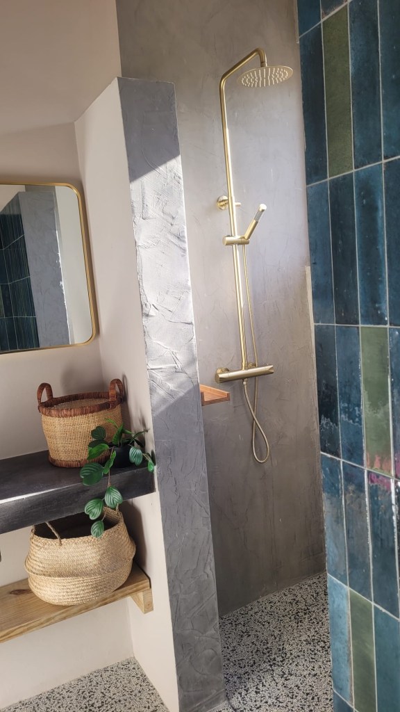 De moderne badkamer is luxe afgewerkt en biedt twee ruime regendouches.